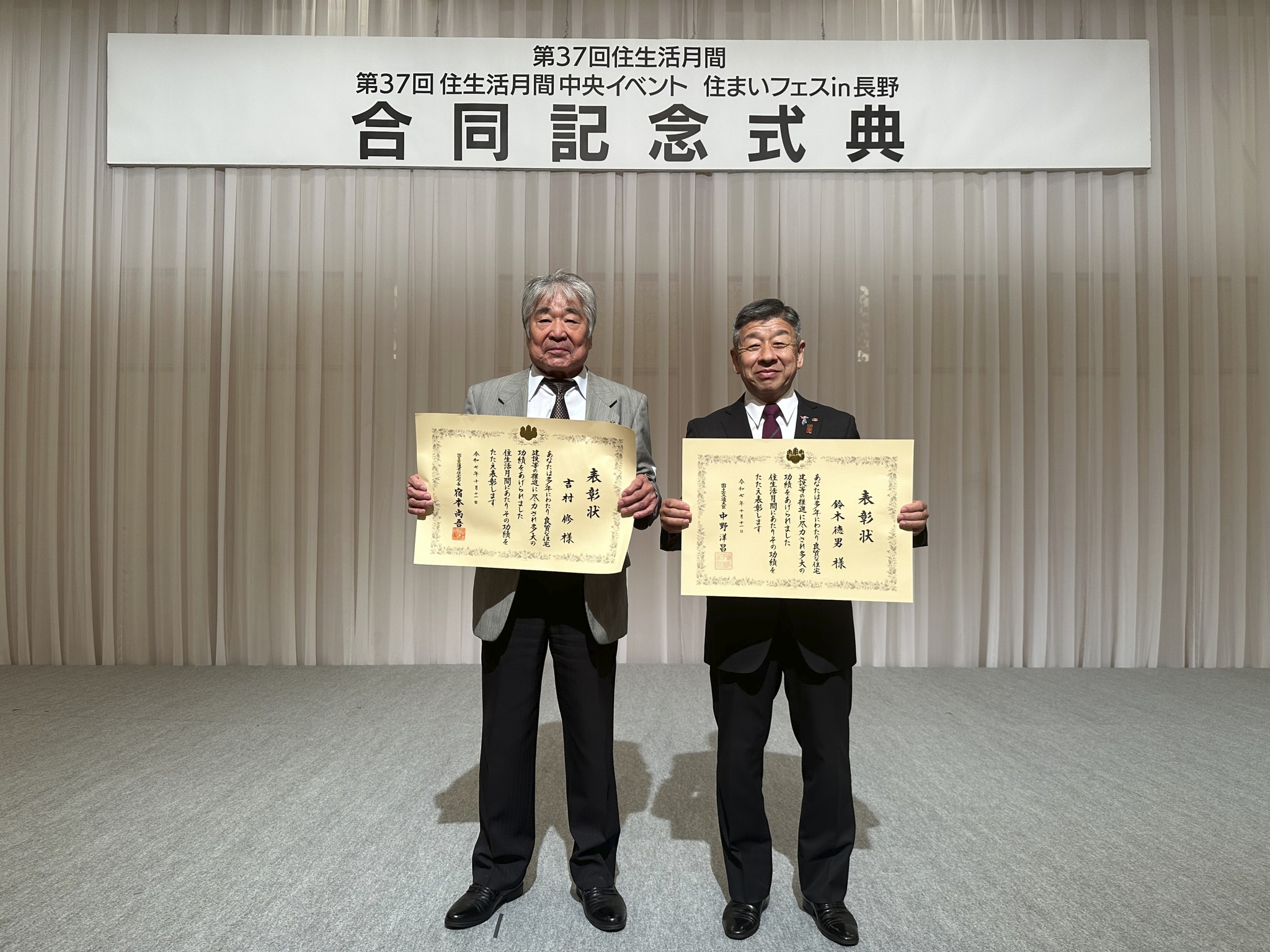 全建総連から推薦した、鈴木徳男さん(千葉土建)が国土交通大臣表彰、吉村修さん(建設山口)が住宅局長表彰を受けました。