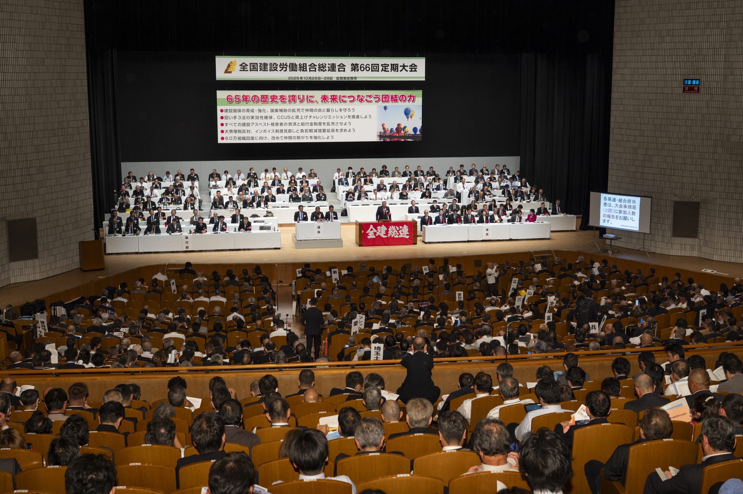 全建総連は、10月28日、29日に、佐賀県佐賀市「佐賀市文化会館」で第66回定期大会を開催。52県連・組合から1265人(11月4日現在)が参加しました。