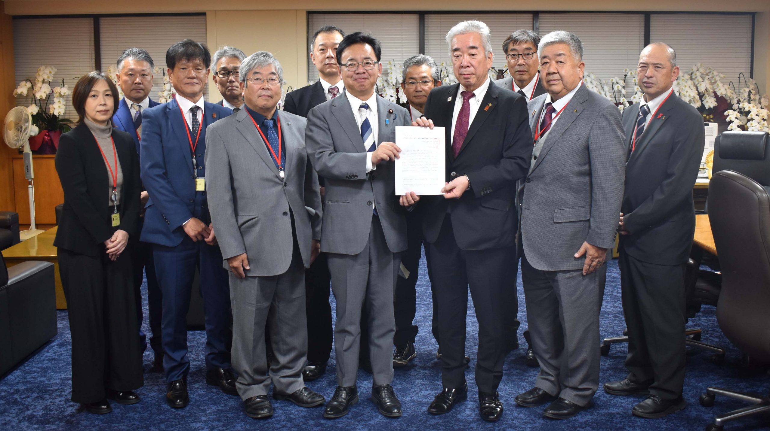 上野賢一郎厚労大臣への要請を12月4日に、大臣の地元である滋賀建築の協力で実施。滋賀建築の冨田組合長、髙村書記長、前田事務局長、全建総連の鈴木委員長を始め18人が参加しました。